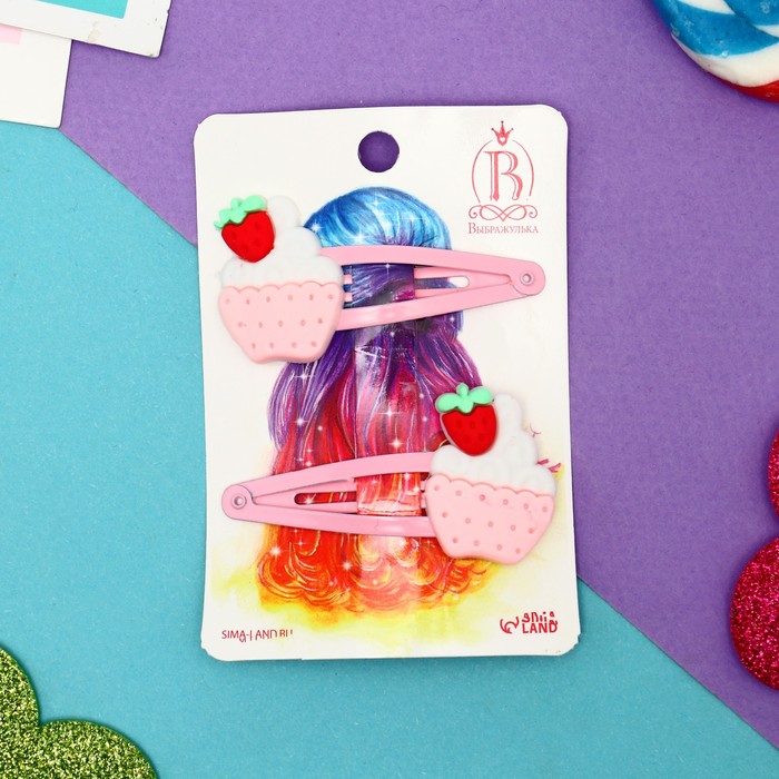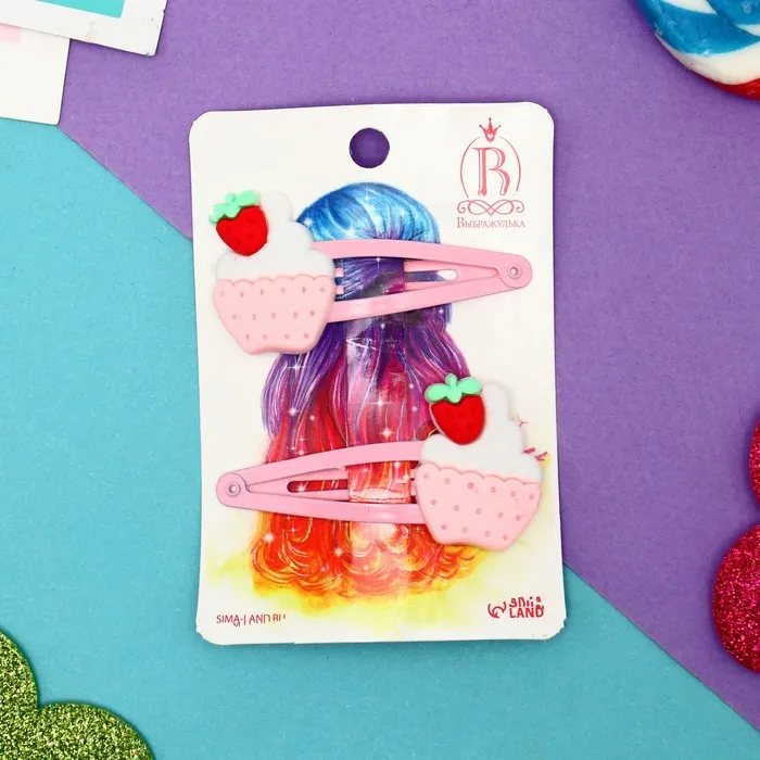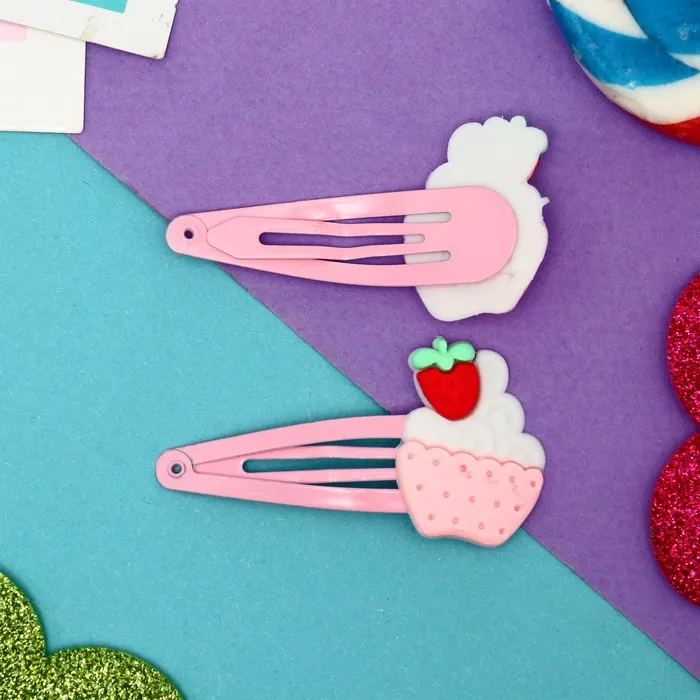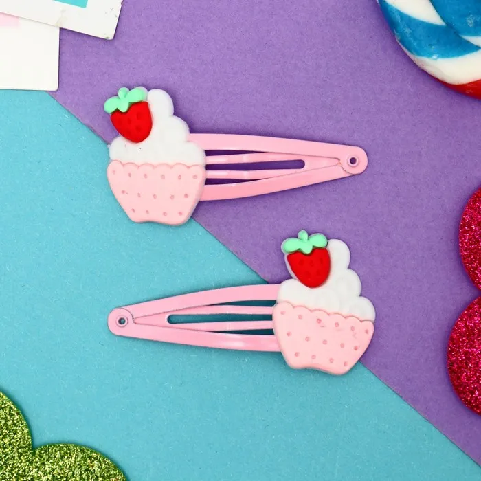 - Яркий розовый цвет: сочетание розового цвета и оригинального дизайна в виде клубничных пирожных подарит радость и свежесть. Заколки поднимут настроение и добавят нотку игривости.