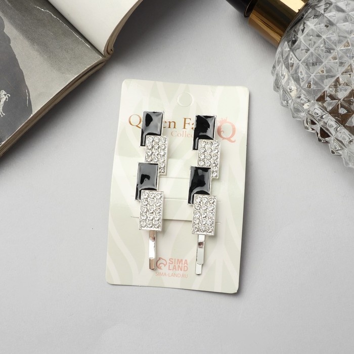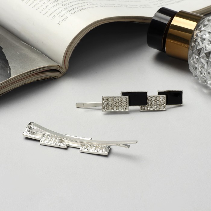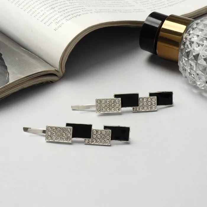 Изысканные невидимки станут незаменимым аксессуаром для создания стильных женских образов. Эта пара заколок выполнена в серебристо-чёрной гамме и подчеркнет утонченность любой прически. Длиной в 6.5 см, каждый предмет из набора сочетает в себе долговечность металла и изящество стеклянных деталей, создавая акцент на каждой прядке.