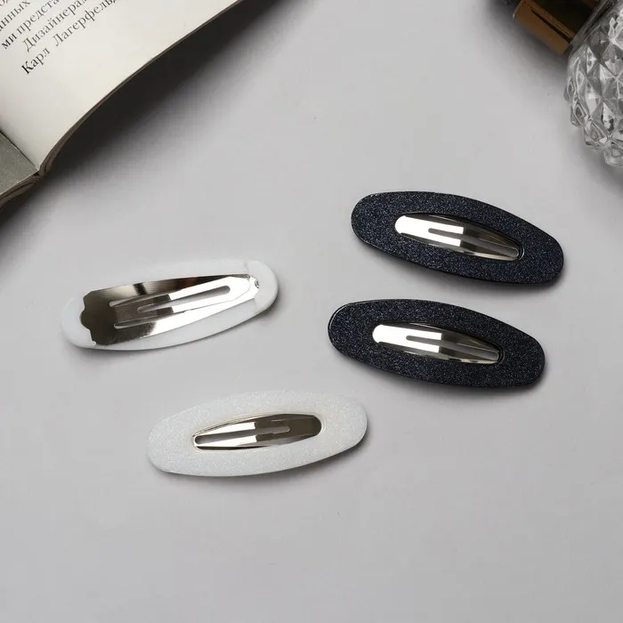Оригинальный набор для волос, состоящий из четырёх миниатюрных заколок овальной формы, станет стильным дополнением к повседневному образу. Лакончиный чёрный и белый дизайн подчёркивает элегантность и подходит для женщин и девочек, создавая акцент на изысканности и утончённости. Прочные материалы, такие как металл и пластик, обеспечивают долговечность и надёжность в использовании.