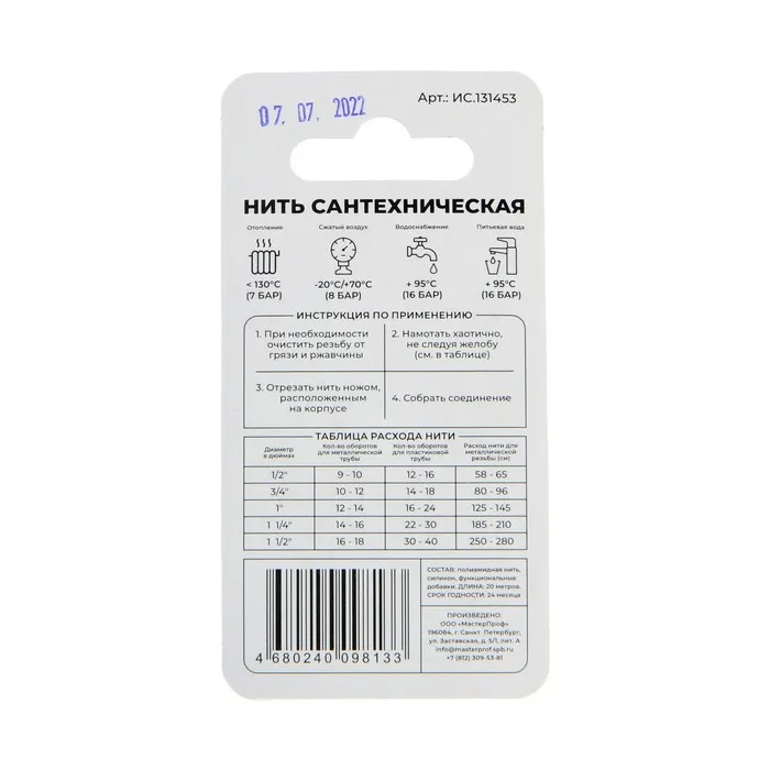 Сантехническая нить MasterProf предназначена для герметизации резьбовых соединений систем водоснабжения и отопления.