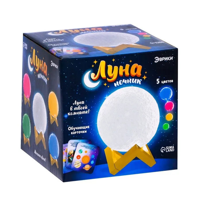 Ночник-луна с образовательными карточками — отличный вариант подарка для детей, увлекающихся астрономией, и взрослых, которые хотят добавить в интерьер необычный и стильный элемент. Он создаст волшебную атмосферу в комнате и сделает каждый вечер чуть уютнее. Работает от 3 батареек типа LR44. В комплект не входят.