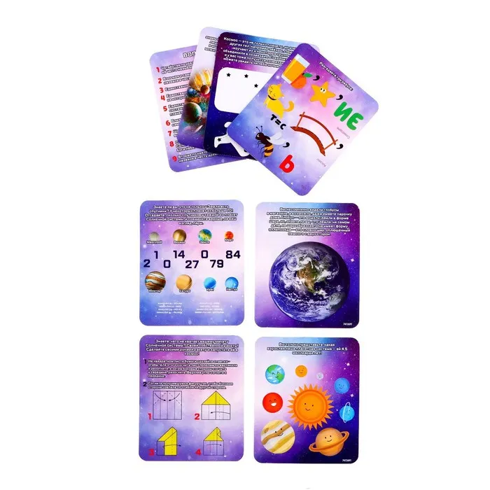 - Обучающие карточки помогут ребёнку узнать больше о космосе в игровой форме.
