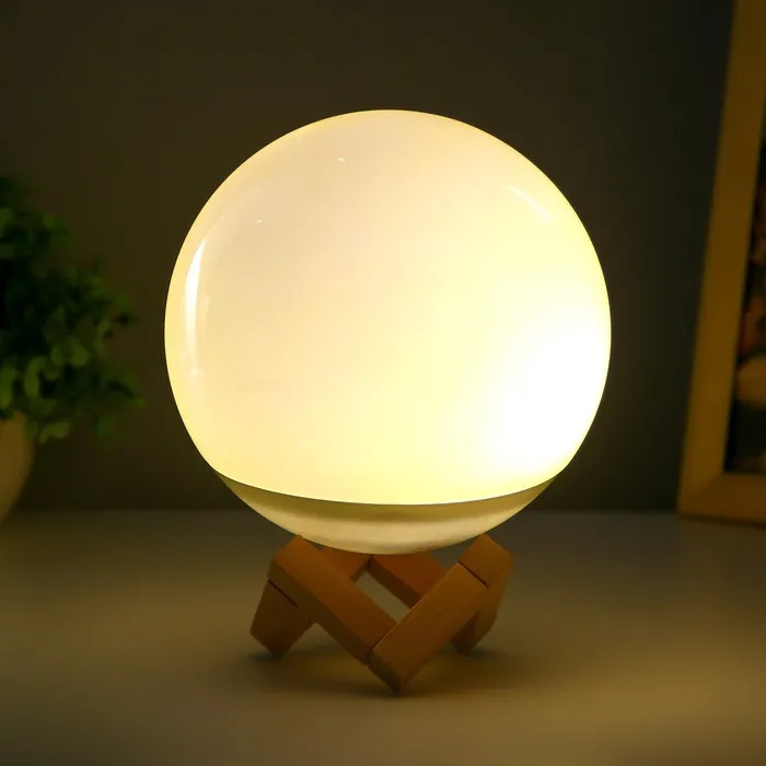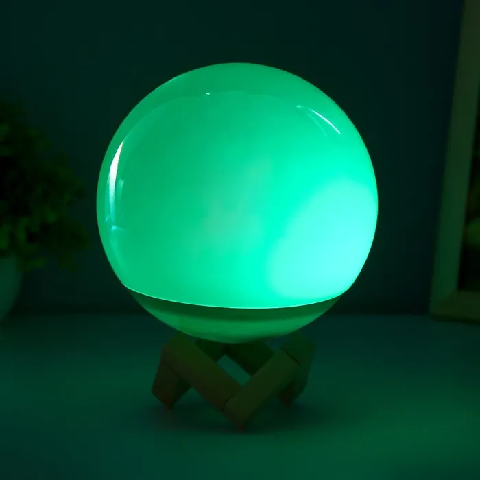 Ночник в форме шара — это стильный и функциональный аксессуар для создания уютной атмосферы в интерьере. Его дизайн с круглым плафоном и светодиодной подсветкой, меняющей 7 цветов, добавляет комнате современности и элегантности. Мягкий свет создаёт комфортную атмосферу, которая подходит для вечернего времени.