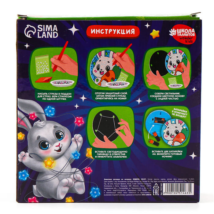 Ночник своими руками. Алмазная мозаика для детей на ночнике «Зайка», 15×15 см, набор для творчества — Характеристики
