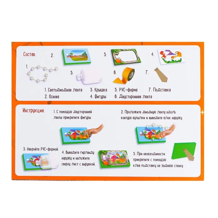 Следуя инструкции, приклейте на основу детали из картона и украсьте их стразами, затем установите светодиодную ленту (выведите блок отдельно). После чего установите пластиковый купол и зафиксируйте всю поделку крышкой. Ночник готов!
