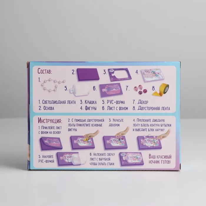 Следуя инструкции, приклейте на основу детали из картона и украсьте их стразами, затем установите светодиодную ленту (выведите блок отдельно). После чего установите пластиковый купол и зафиксируйте всю поделку крышкой. Ночник готов!