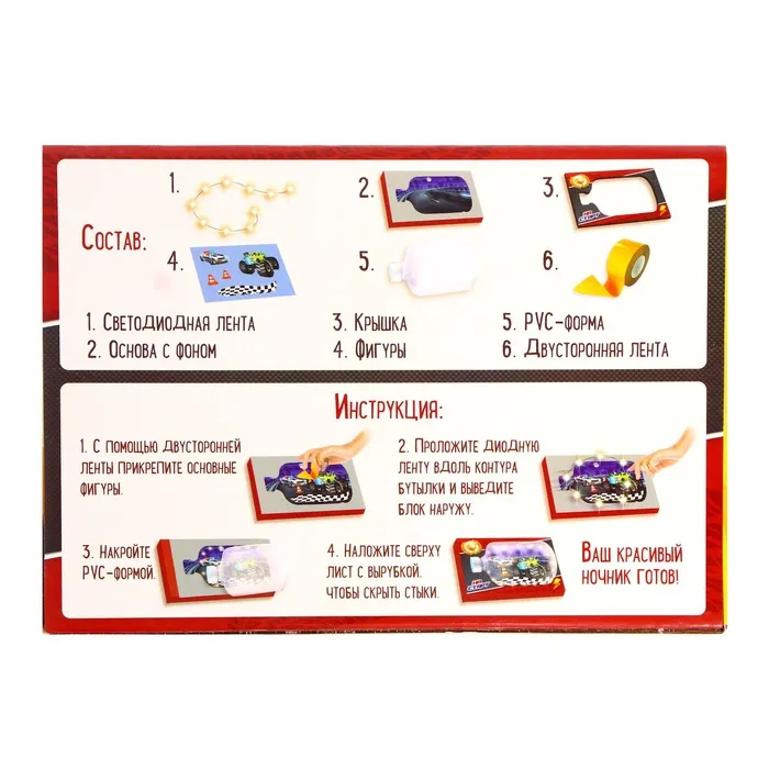 Следуя инструкции, приклейте на основу детали из картона и украсьте их стразами, затем установите светодиодную ленту (выведите блок отдельно). После чего установите пластиковый купол и зафиксируйте всю поделку крышкой. Ночник готов!