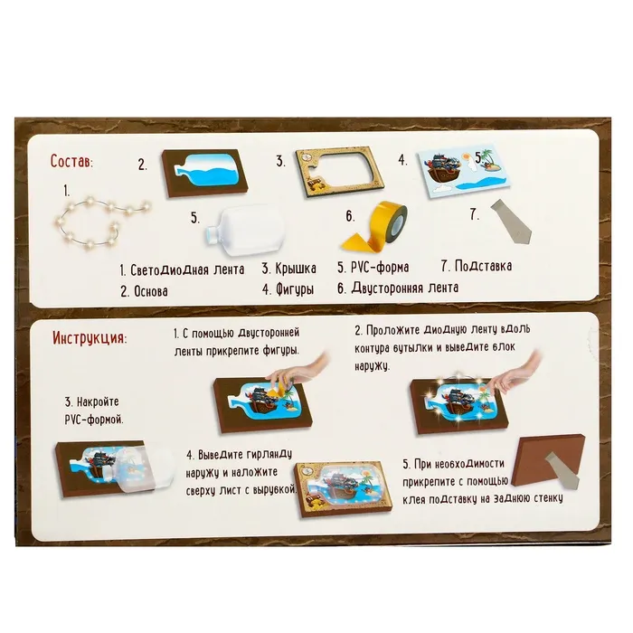 Следуя инструкции, приклейте на основу детали из картона и украсьте их стразами, затем установите светодиодную ленту (выведите блок отдельно). После чего установите пластиковый купол и зафиксируйте всю поделку крышкой. Ночник готов!