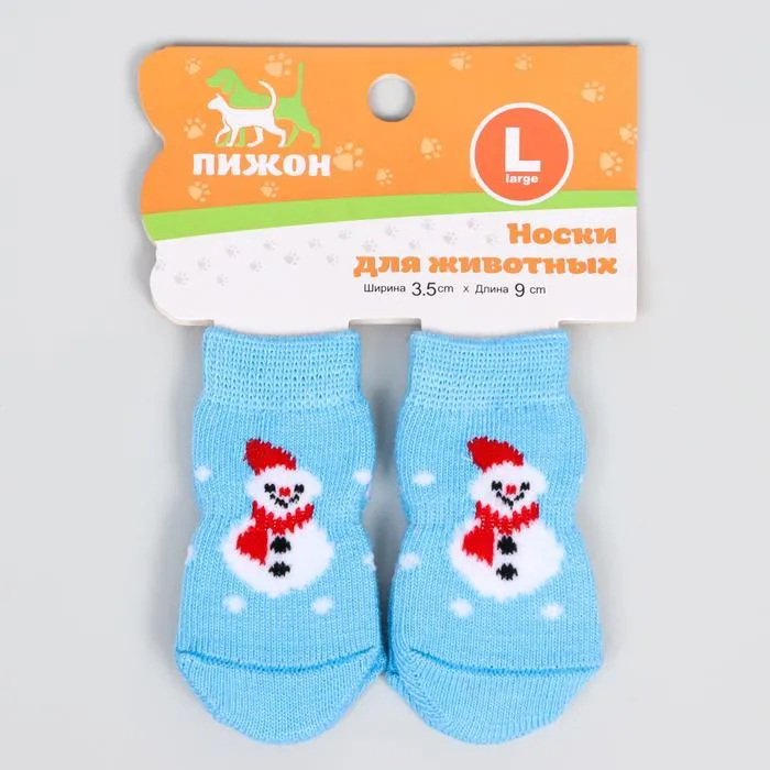 Носки нескользящие для животных "Снеговики", L (3,5/5 * 8 см), набор 4 шт, голубые