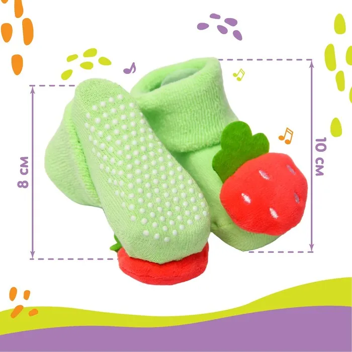Носочки погремушки со звуковым эффектом не только согреют ножки вашего малыша, но и привлекут его внимание яркими цветами, а также звоном погремушек. Малыш сможет до них дотянуться, потрогать ручками или просто погреметь ими, подергав ножками. Малыш играет и развивает не только мышцы, но и координацию, моторику, внимание, зрение, слуховое восприятие. Милые игрушки пробуждают его стремление исследовать мир вокруг себя. Изготовлены из качественного и безопасного для здоровья детей материала, который не выцветает. Станут отличным подарком вашим близким.
