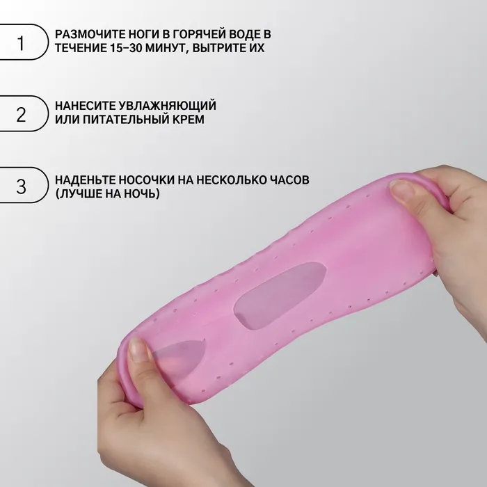 Использовать изделие предельно просто: размочите ноги в горячей воде в течение 15–30 минут, вытрите их, нанесите увлажняющий или питательный крем и наденьте носочки на несколько часов (лучше на ночь). Их можно использовать отдельно или в комплексе спа-ухода за ногами.