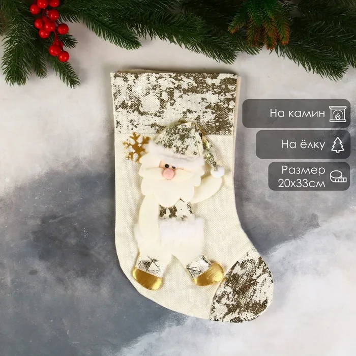 Носок для подарков «Дед Мороз в колпаке с поталью», 20×33 см, золотистый — Характеристики