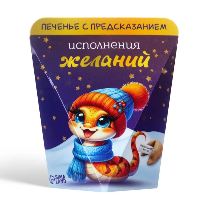 Коробка, в которой упаковано это чудесное печенье, украшена ярким изображением символа 2025 года — змеи, что делает его идеальным подарком на Новый год и Рождество. Печенье "Исполнения желаний" отлично подойдёт для праздничного стола, корпоративов, вечеринок или просто для уютного вечера в кругу близких. Угощая своих друзей этими печеньями, вы дарите им не только сладость, но и порцию счастья и улыбок. Пусть каждый кусочек станет началом новой радостной истории и источником вдохновения для весёлых свершений!