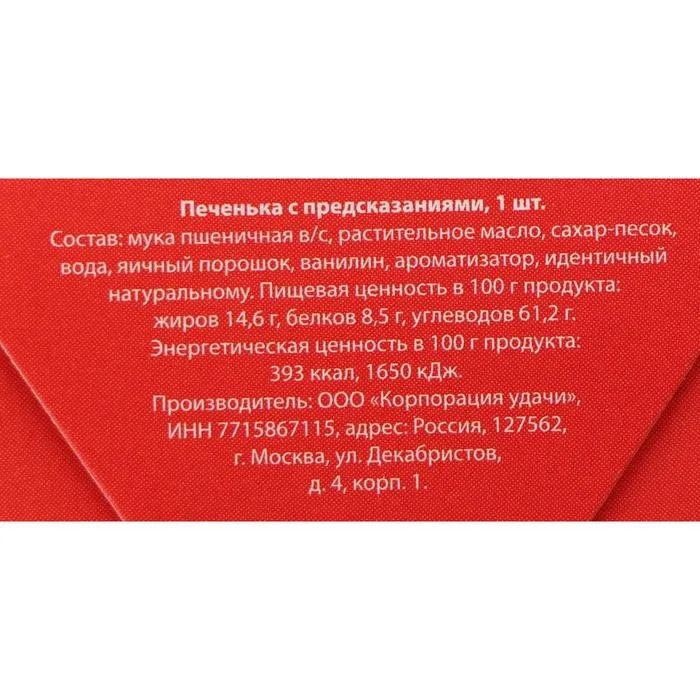 Это печенье представляет собой небольшое хрустящее лакомство, в котором запечен листочек с предсказанием. Печенье может стать не только вкусным десертом, но и отличным вариантом подарка близкому человеку. Он обязательно оценит неординарный подход, а оригинальная надпись-сюрприз оставит после себя массу положительных эмоций!