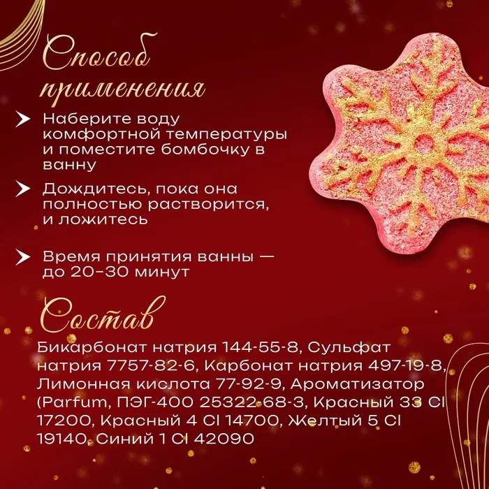 Кроме того, бомбочка имеет яркий и красочный дизайн, который придаст вашей ванной комнате новогоднюю атмосферу и создаст ощущение праздничного волшебства.