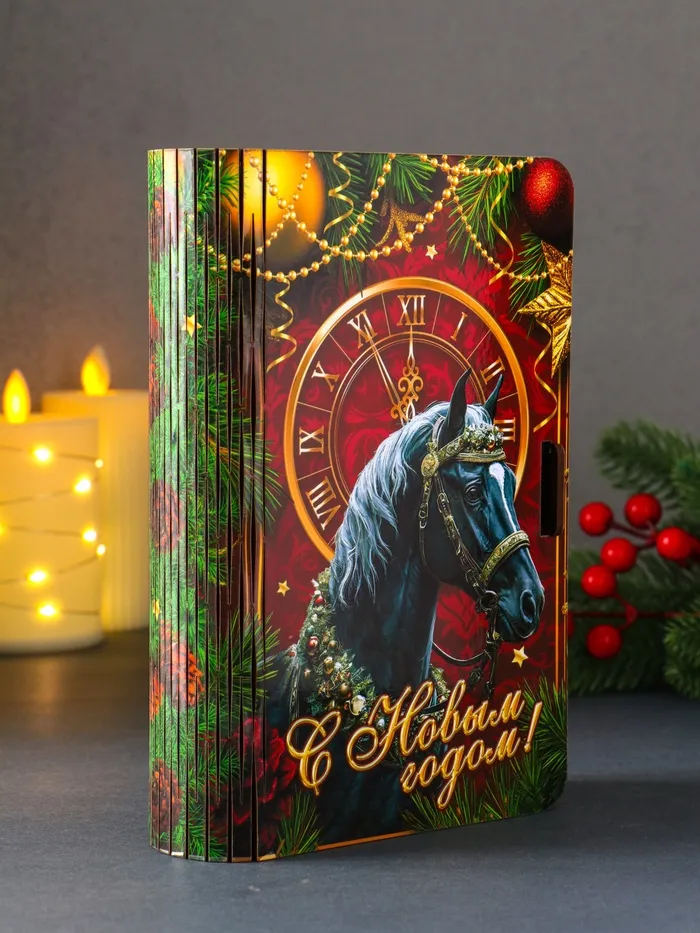Позвольте себе прикоснуться к магии праздника, скрытой в изящном форм-факторе, который идеально впишется в интерьер вашего дома. Эта шкатулка, выполненная в виде старинного фолианта, хранит в себе не только пространство для хранения, но и символичный образ наступающего времени — величественного коня, стремительно несущего нас к новым свершениям.