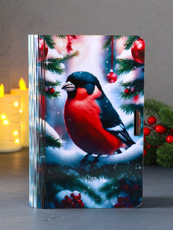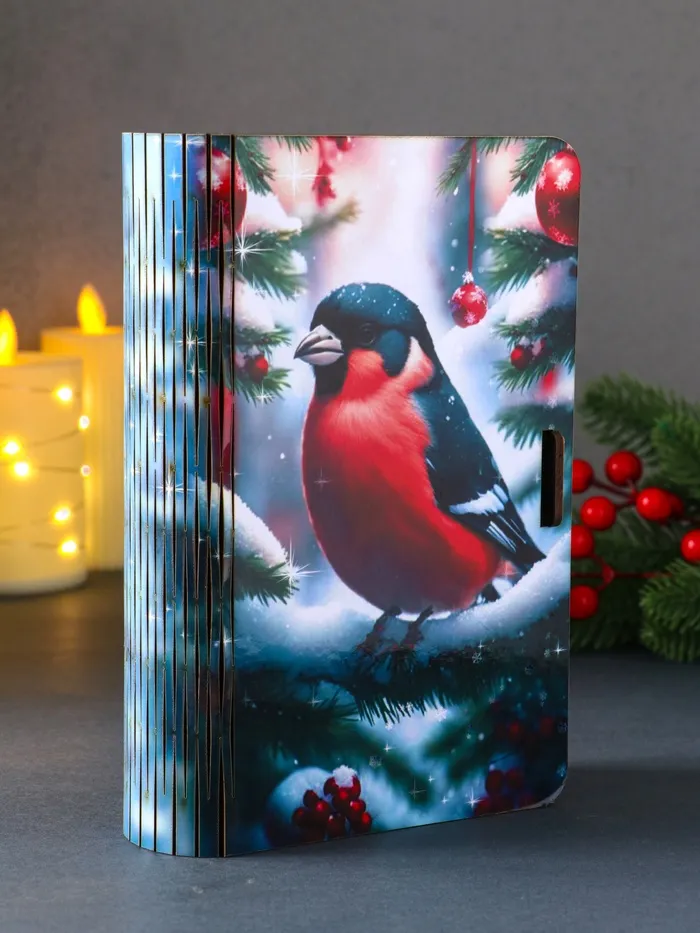 Эта новогодняя шкатулка-книга станет изящным завершением вашего праздничного подарка. Её формат в виде старинного фолианта создаёт ощущение волшебной тайны, а изображение снегиря на пушистой ёлке наполняет пространство тёплым ожиданием чуда. Внутри вас ждёт удобное отделение для хранения особенных мелочей, ювелирных украшений или памятных записок.