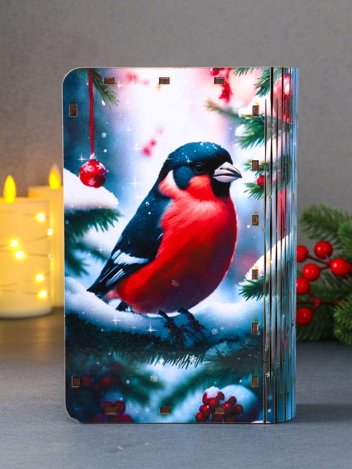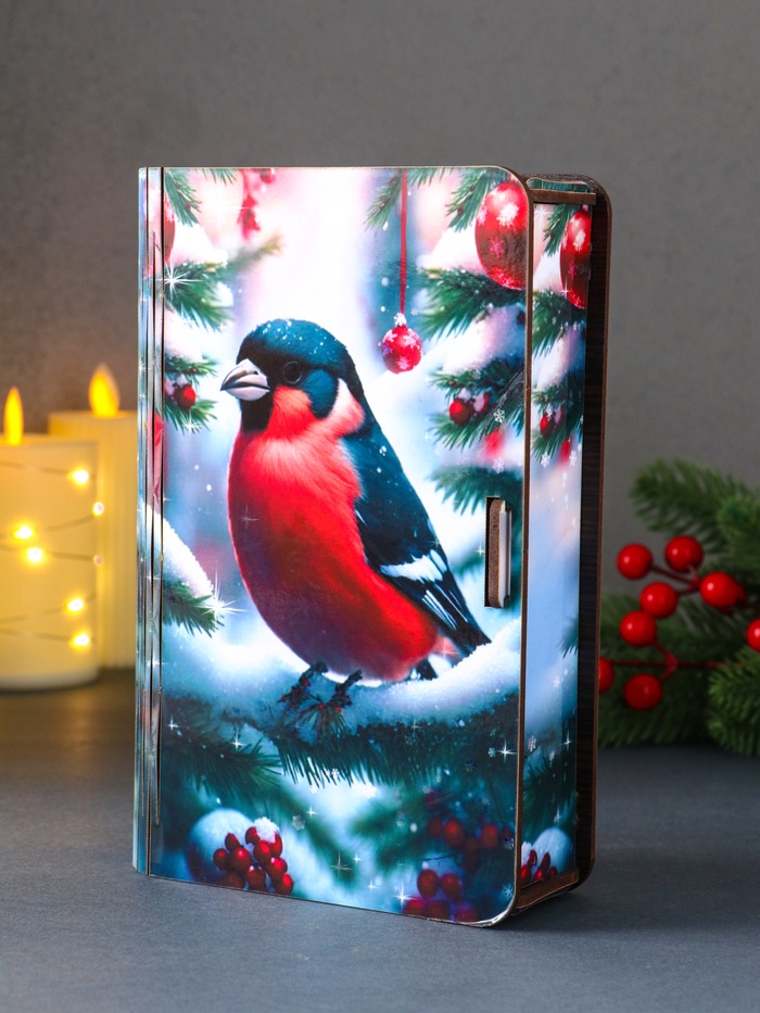 Эта новогодняя шкатулка-книга станет изящным завершением вашего праздничного подарка. Её формат в виде старинного фолианта создаёт ощущение волшебной тайны, а изображение снегиря на пушистой ёлке наполняет пространство тёплым ожиданием чуда. Внутри вас ждёт удобное отделение для хранения особенных мелочей, ювелирных украшений или памятных записок.