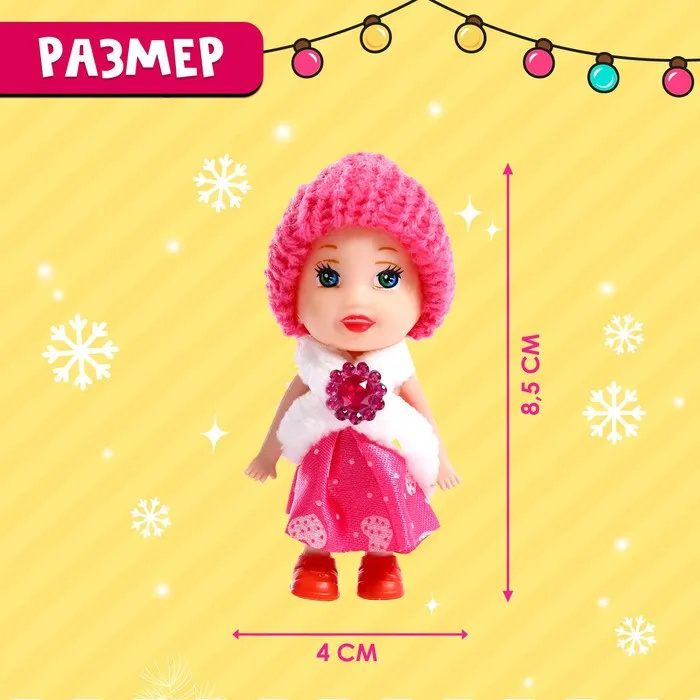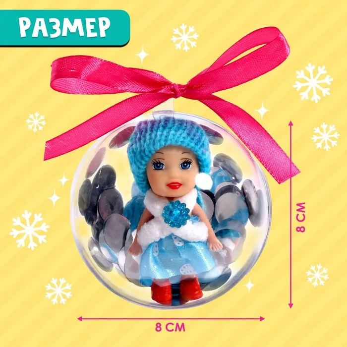 - Нежная куколка высотой 8 см находится внутри прозрачного шара размером 8 × 8 см и станет прекрасным компаньоном для игр. Её шапочка надежно прикреплена к голове.