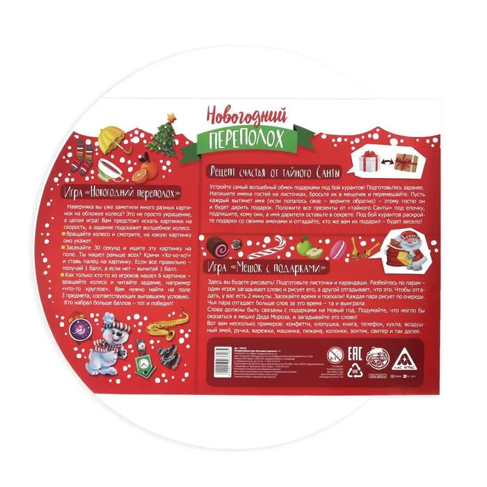 Исследования Деда Мороза доказали: игра на внимательность объединяет компании любого возраста. Вдохновитесь яркими картинками на обложке, ведь среди них вам предстоит искать изображения на скорость! А волшебное колесо подскажет, что необходимо найти. Каждая находка принесёт победный балл!