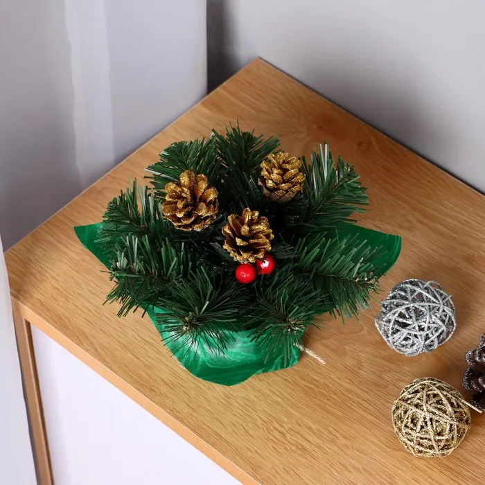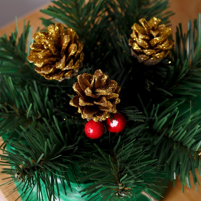 Новогодняя хвойная композиция на стол 20 см «Рождественская», декор шишки золото, ягоды — Характеристики