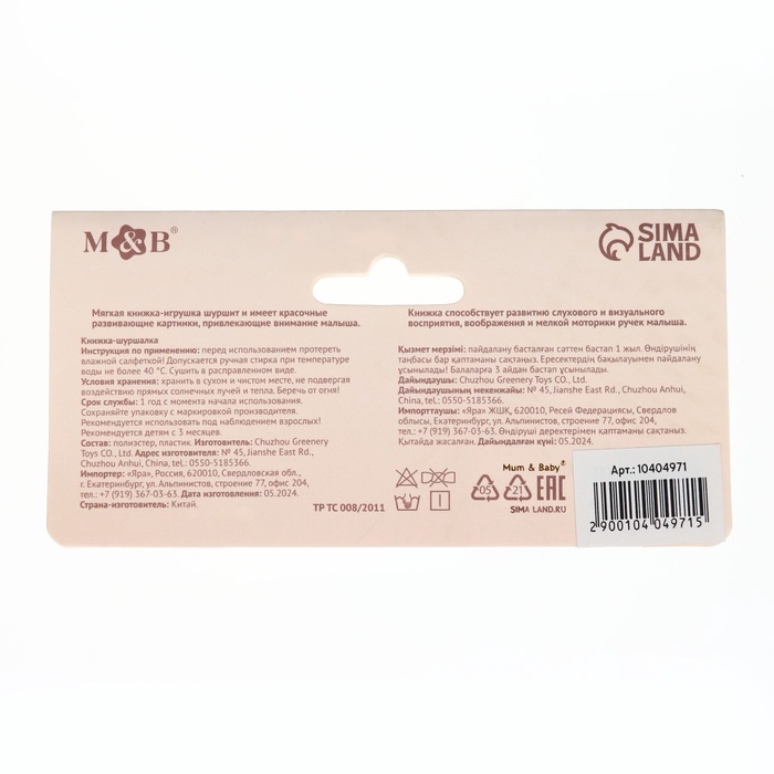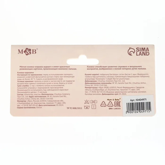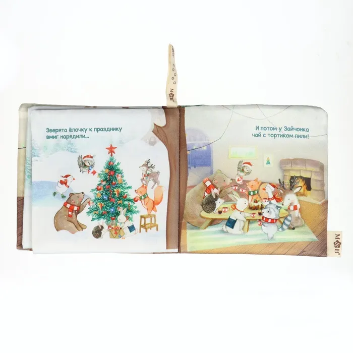 - Книжка выполнена из мягкого текстиля с шуршащими элементами для тактильного и звукового развлечения.