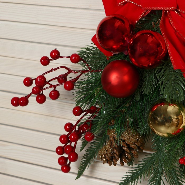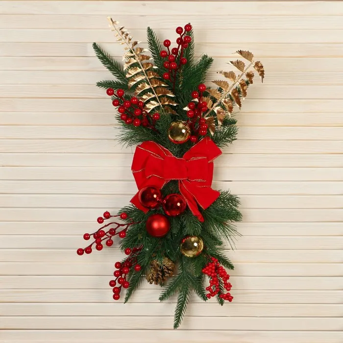 Погрузитесь в атмосферу зимней сказки с очаровательным украшением, которое превратит ваш дом в уголок праздничного очарования. Хвойная композиция, дополненная ярким бантом, станет идеальным акцентом для любого интерьера.