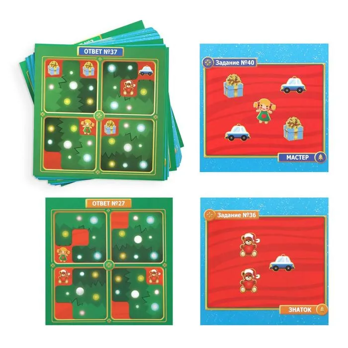 Вы получите карточку с заданием от эльфов. В набор входят магнитные детали и поле с изображением игрушек. Поместите элементы на него так, чтобы были видны только те предметы, которые указаны в задании. А после смотрите ответ на обороте карты. Вот такая увлекательная задачка!