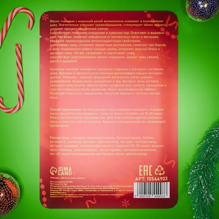 Новогодняя маска для лица, тканевая, увлажняющая, с ароматом морозной розы — Характеристики