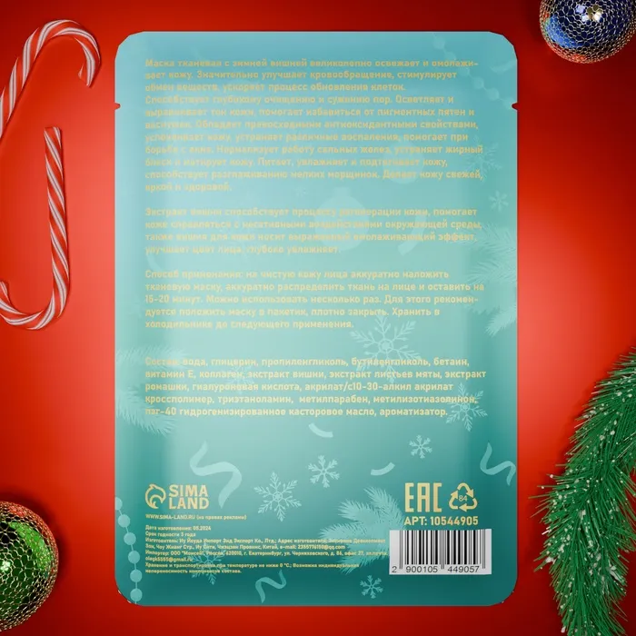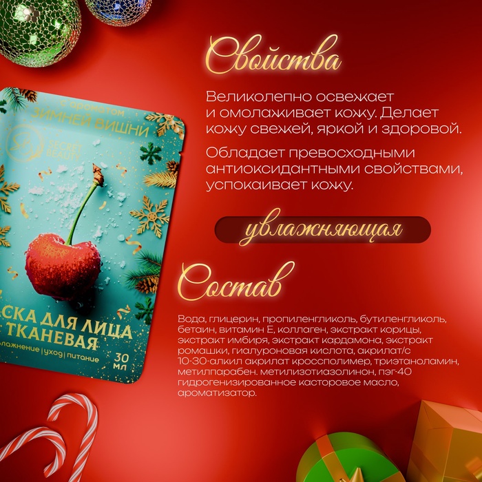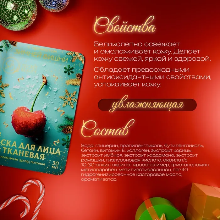 Новогодняя маска для лица, тканевая, увлажняющая — это идеальный способ побаловать себя и своих близких в Новый год. Маска создана для глубокой увлажняющей заботы о коже, обеспечивая ей интенсивное питание и свежесть. Тканевая основа плотно прилегает к коже, позволяя активным ингредиентам проникать и работать эффективно.