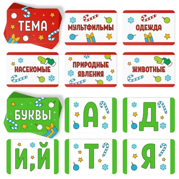 Первый участник вытягивает карточку из двух колод: с темами и буквами. После этого игрокам нужно быстрее всех назвать слово, начинающееся на указанную букву и соответствующее заданной теме. На некоторых картах указаны сразу две буквы. Участники могут назвать слово на любую из имеющихся у них.