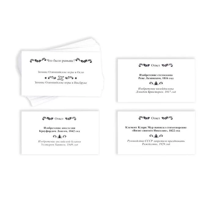 На одной стороне карточки написан вопрос и два варианта ответа. Ваша задача — определить, какое из двух событий было раньше. Чтобы проверить себя или другого участника, просто переверните карту. Там находится ответ и небольшая пояснительная информация.