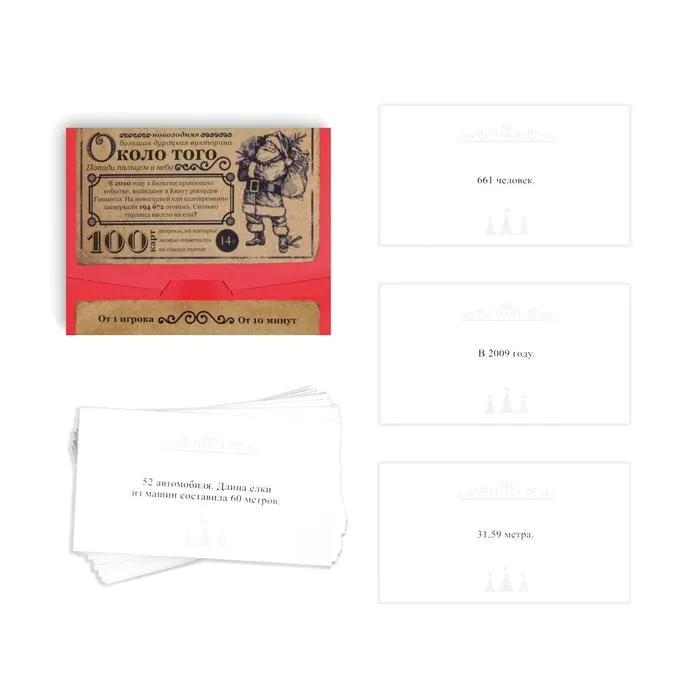 На одной стороне карточки написан вопрос, а на другой — ответ. Задача каждого игрока — дать ответ в виде числа. Тот, кто окажется ближе всех к правильному, забирает карту. Победит обладатель наибольшего количества баллов.