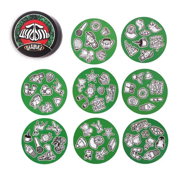 Первый, кто найдёт такую картинку, кричит её название, забирает верхнюю карту из колоды и кладёт её сверху на свою карту. Тем самым он открывает следующую карточку из основной колоды. Теперь совпадения нужно искать уже с другими картинками. А как только все карты в колоде закончатся, переходите к подведению итогов. Игрок, который набрал больше всех карт, объявляется победителем!