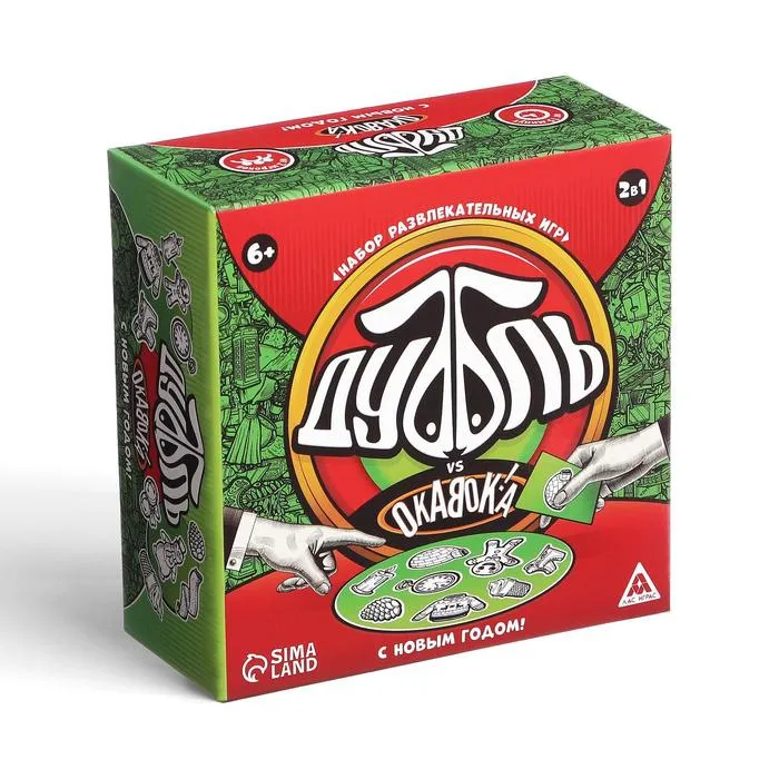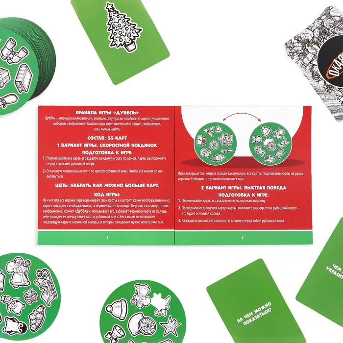В этой коробке вас ждут две новогодние игры, которые мы взяли и совместили. Да-да, именно так! Играйте в «Дуббль» по обычным правилам, а в качестве игрового поля для «Окавоки» используйте карточки от «Дуббля». Всё очень просто, а главное — весело!