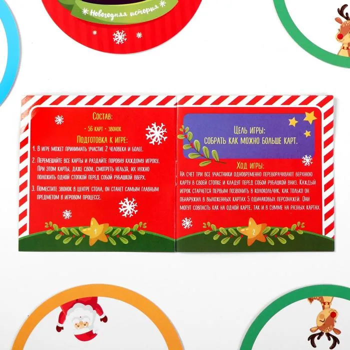 Что нужно делать, чтобы весело и интересно встретить Новый год? Собрать друзей и всю семью, поставить звонок в центре стола, перемешать карточки и раздать всем поровну. Дальше начинается самое интересное! Если на столе окажется 5 одинаковых персонажей, нажимайте на звонок и забирайте карты. Победит самый быстрый и внимательный!