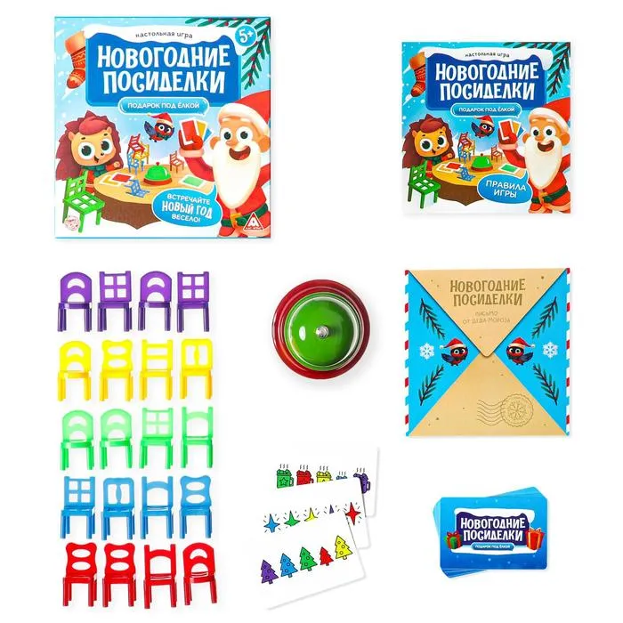 В этой праздничной коробочке вы найдёте увлекательную игру на реакцию, внимание и ловкость! А смех, веселье и отличное времяпрепровождение — приятный бонус для любой компании. Смотрите на картинки, расставляйте стульчики на скорость и быстрее остальных звоните в звоночек!