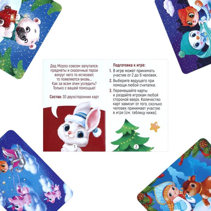 Далее игроки внимательно рассматривают карты, которые лежат на столе. Затем все закрывают глаза, а ведущий переворачивает любую карточку на столе и громко говорит: «Новогодняя пропажа».