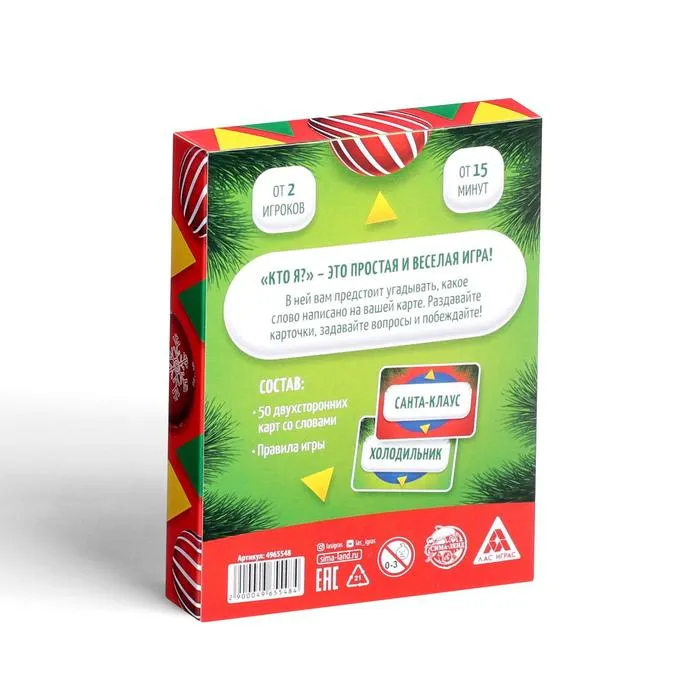 Новый год — прекрасная пора, чтобы собраться всей семьей и сыграть в «Кто я?». У вас на лбу будет карточка со словом. Задавайте вопросы, на которые можно ответить только «да» или «нет», и угадывайте, что написано на вашей карте.