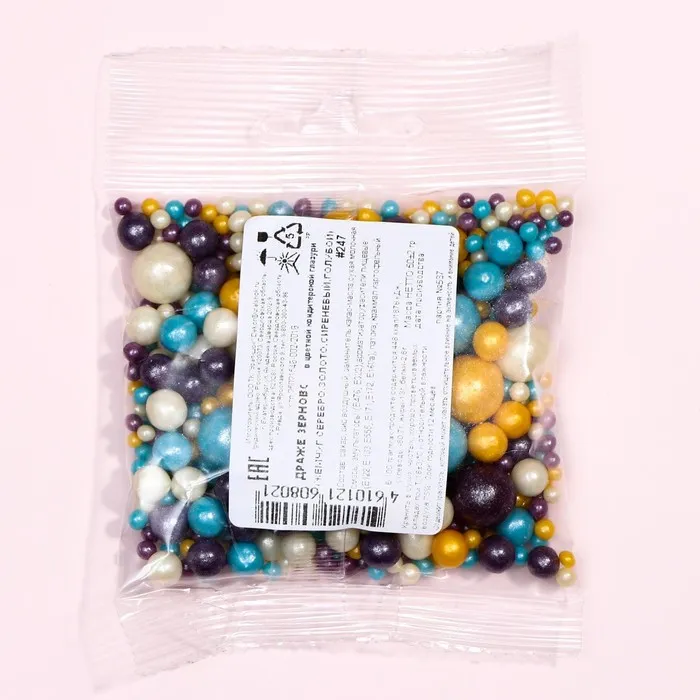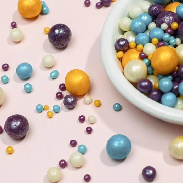 Новогодняя посыпка кондитерская с мягким центром «Жемчуг»: золотая, голубая, сиреневая, серебро, 50 г — Характеристики