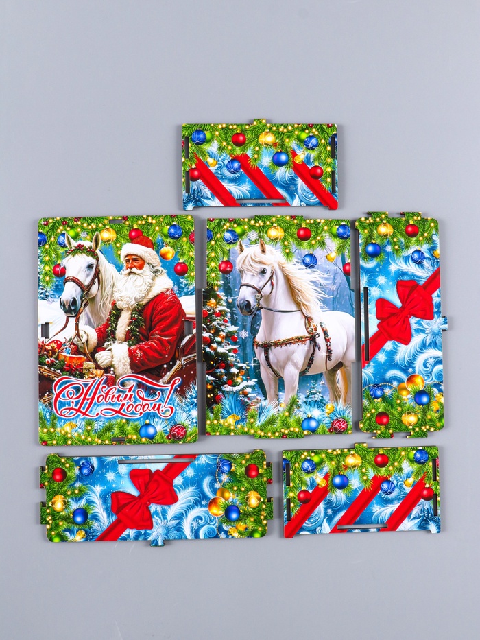 - Особенности: самосборная конструкция, новогодняя тематика с изображением Деда Мороза и лошади.