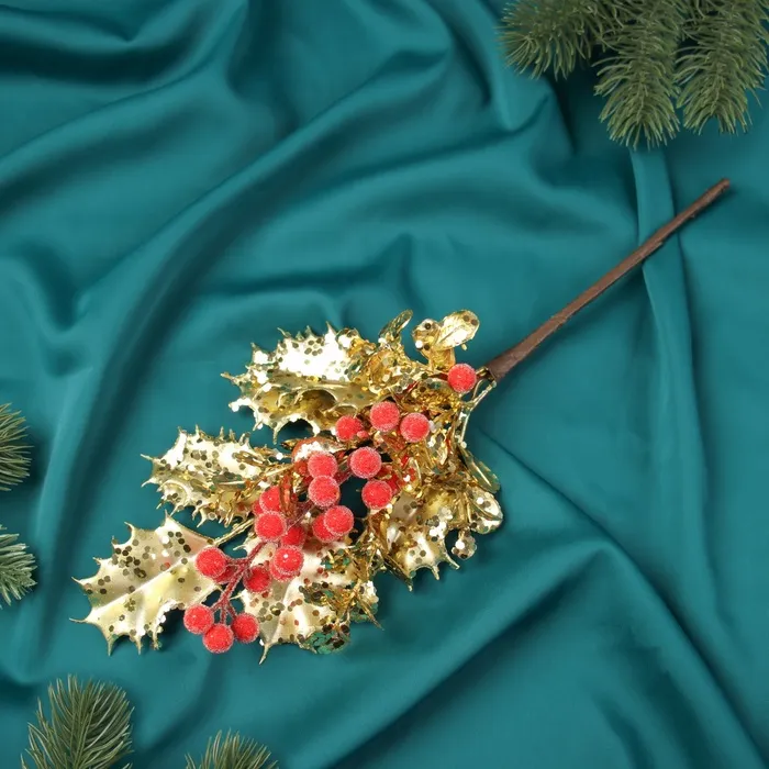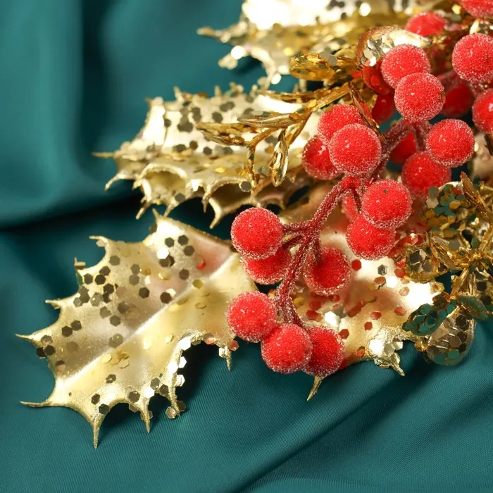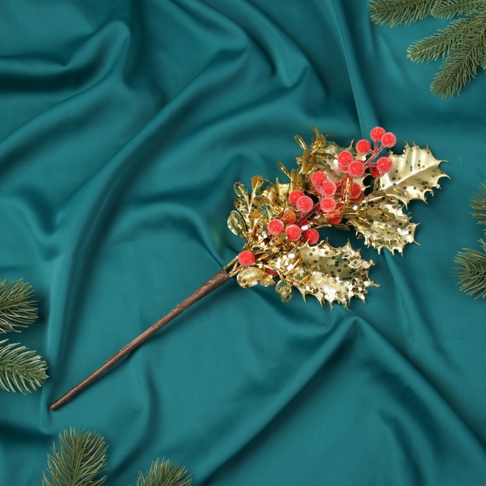 Новогодняя ветка декоративная «Зимнее волшебство. Грация», пластик, ягодки, листочки, 30×12 см, красно-золотой — Характеристики