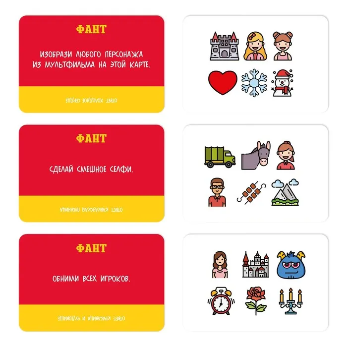 На каждой карте есть несколько картинок, в которых зашифрован фильм или мультфильм. Тот из игроков, кто первым угадает и назовёт правильный ответ, выбирает участника, который будет выполнять фант с оборота карты.