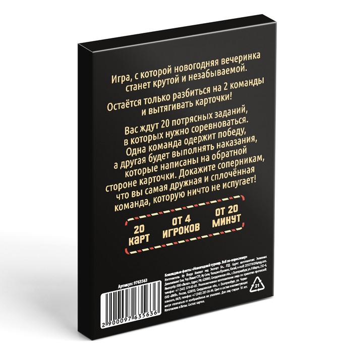 Вас ждут 20 потрясных заданий, в которых нужно соревноваться. Одна команда одержит победу, а другая будет выполнять наказания, которые написаны на обратной стороне карточке. Докажите соперникам, что вы самая дружная и сплочённая команда, которую ничто не испугает!