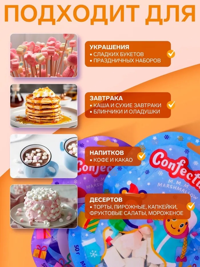 Каждый кусочек мягкого и воздушного маршмеллоу обладает насыщенным вкусом. Яркие цвета делают этот десерт не только вкусным, но и визуально привлекательным, добавляя веселое настроение в ваш день.