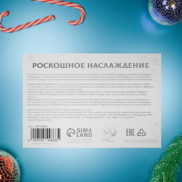 Новогодние гидрогелевые патчи плотно прилегают к коже, наделяя её полезными веществами, входящими в состав. Они борются с отечностью, делают темные круги менее выраженными, напитывают кожу влагой и наполняют её витаминами.
