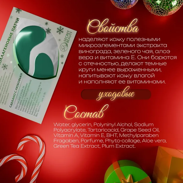 Новогодние гидрогелевые патчи плотно прилегают к коже, наделяя её полезными веществами, входящими в состав. Они борются с отечностью, делают темные круги менее выраженными, напитывают кожу влагой и наполняют её витаминами.