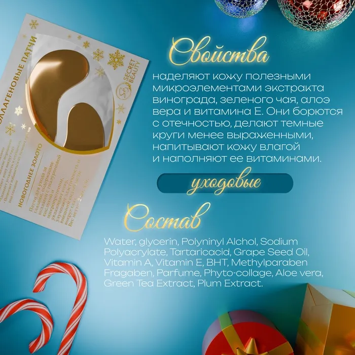 Новогодние гидрогелевые патчи плотно прилегают к коже, наделяя её полезными веществами, входящими в состав. Они борются с отечностью, делают темные круги менее выраженными, напитывают кожу влагой и наполняют её витаминами.