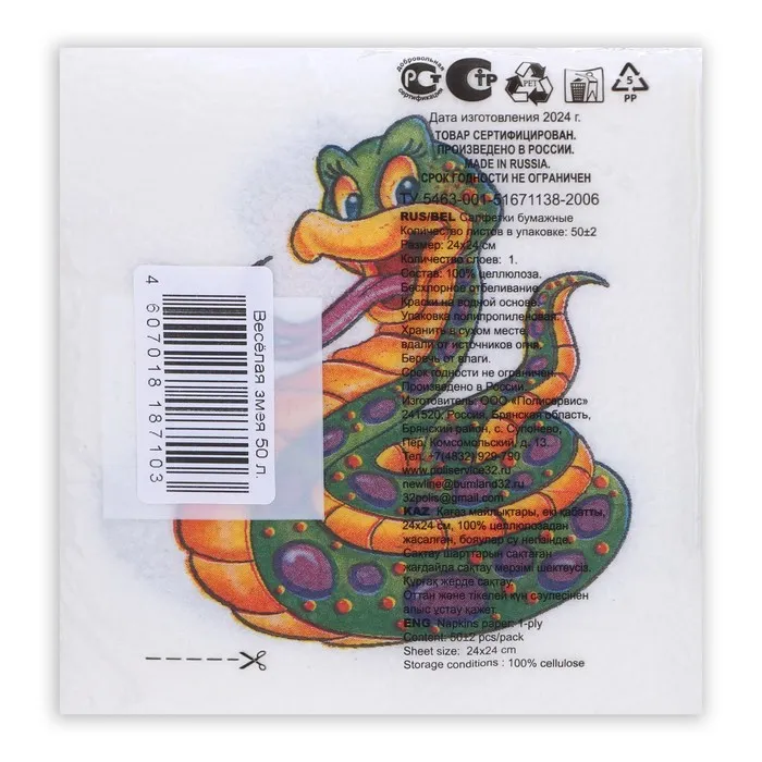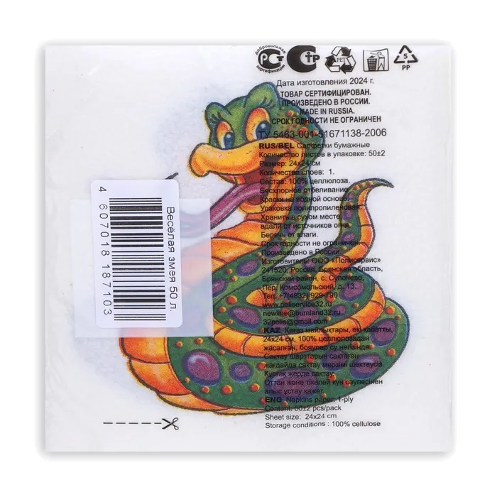Новогодние салфетки бумажные Гармония цвета «Весёлая змея» 1 слой, 24х24 см, 50 шт — Характеристики