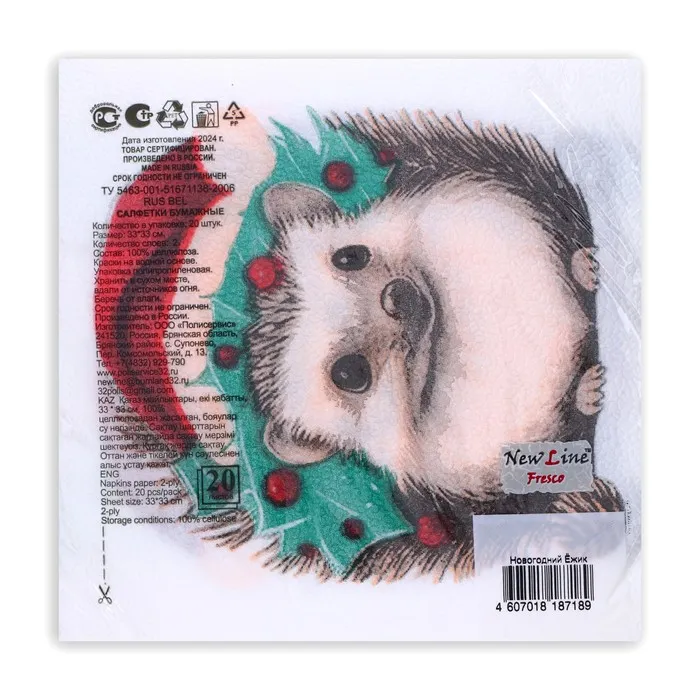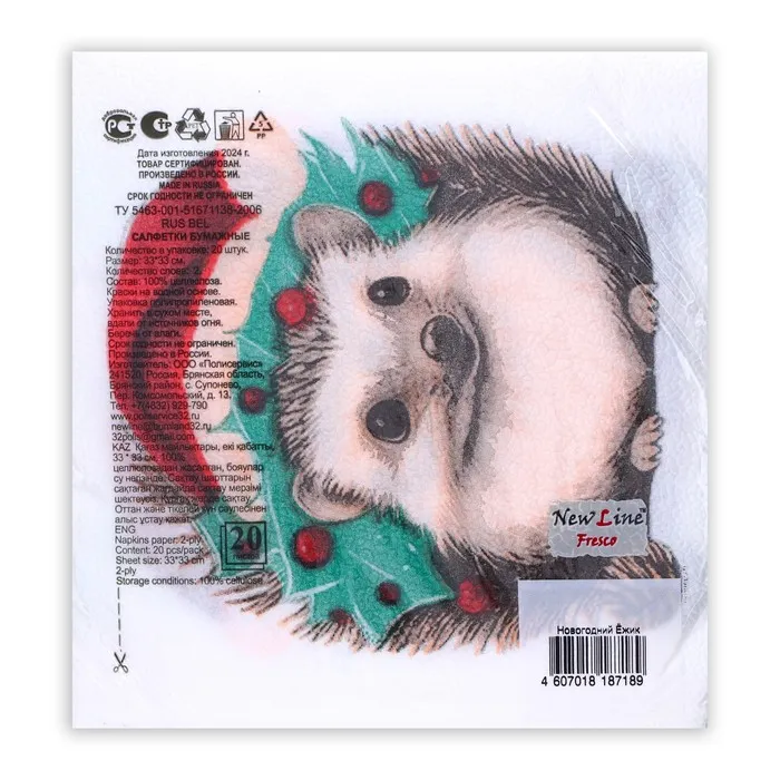 Новогодние салфетки бумажные «Новогодний ёжик» 2 слоя, 33×33 см, 20 шт. — Характеристики